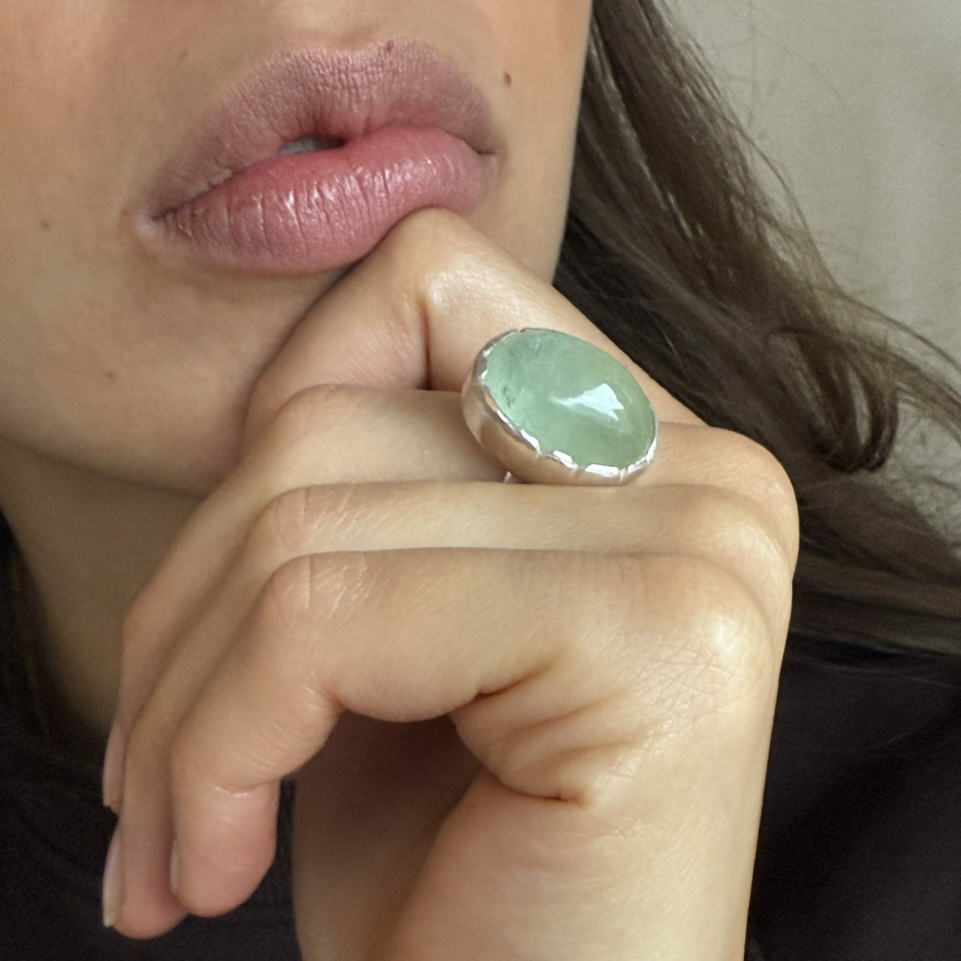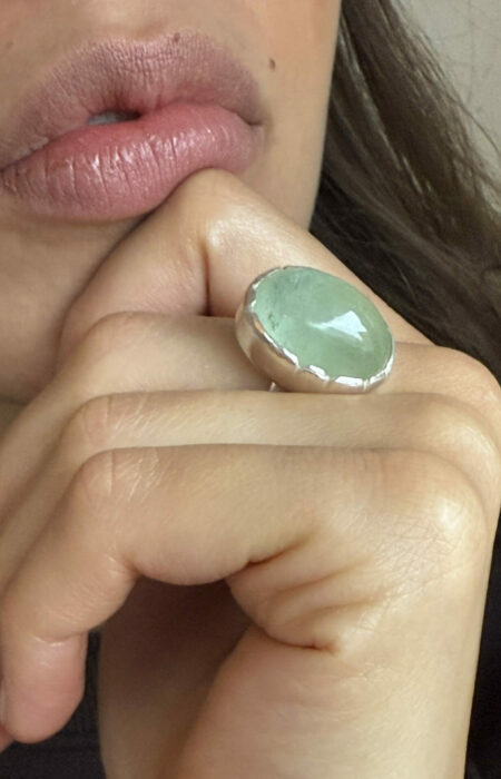 Det är stor akvamarin i cabochonslipning – mjukt rundad, med ett nästan drömskt skimmer. Ringen får karaktär av den ovanliga fattningen, som en knopp som snart ska slå ut. Som alla ringar jag gör är den handgjord, och varje detalj formad för att framhäva stenens och ge smycket en egen personlighet. Akvamarinens ton drar tankarna till hav och klarhet. Med en hårdhet på 7,5–8 enligt Mohs-skalan passar den utmärkt för vardagsanvändning.
