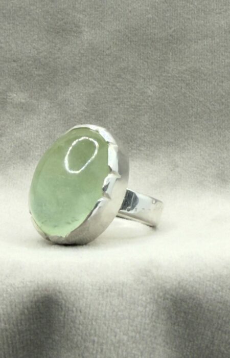 Sargen i fattningen är lätt hamrad, samma vinklar som i stenens slipning som har strålformade fasetter på undersidan. Som ljusgrönt vatten mot vit sandbotten.