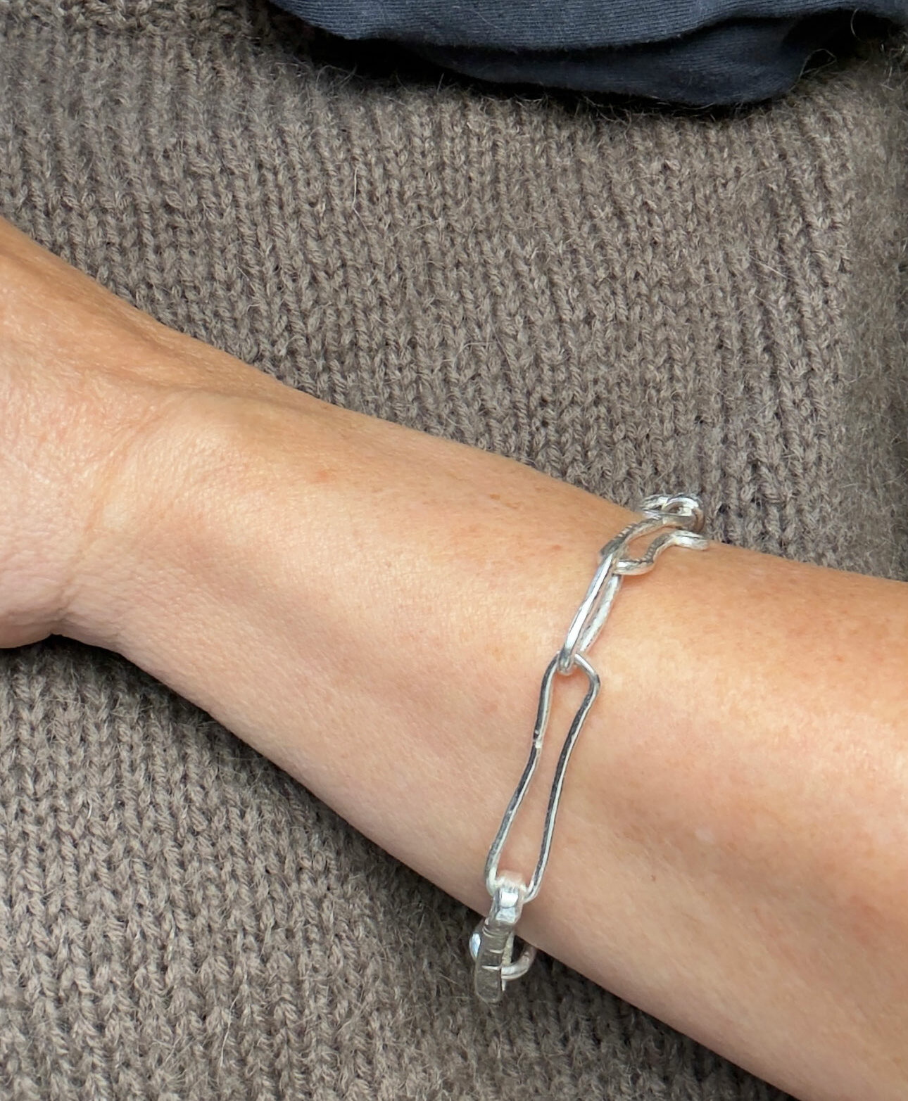 Handsmidd silverlänk med grövre tråd, 5 mm. Länkarna är mellan 2,5 och 3 cm långa – lite längre än ett genomsnittligt armband. Varje länk bearbetad med fil och hammare för att få struktur. Ser ut som ett armband som levt, fast det är nytt.