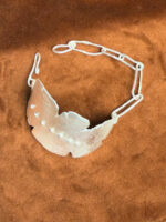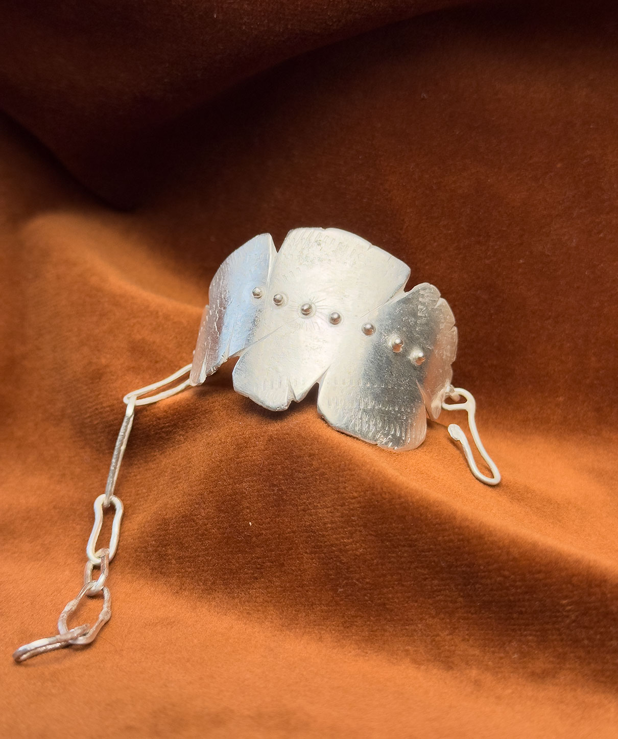 Stelt armband – en så kallad cuff – med handsmidda länkar. Kombination som gör att armbandet faktiskt sitter bekvämt trots att det är stelt. Handleder ser ju olika ut, med de mindre länkarna så följer den bättre din form.
