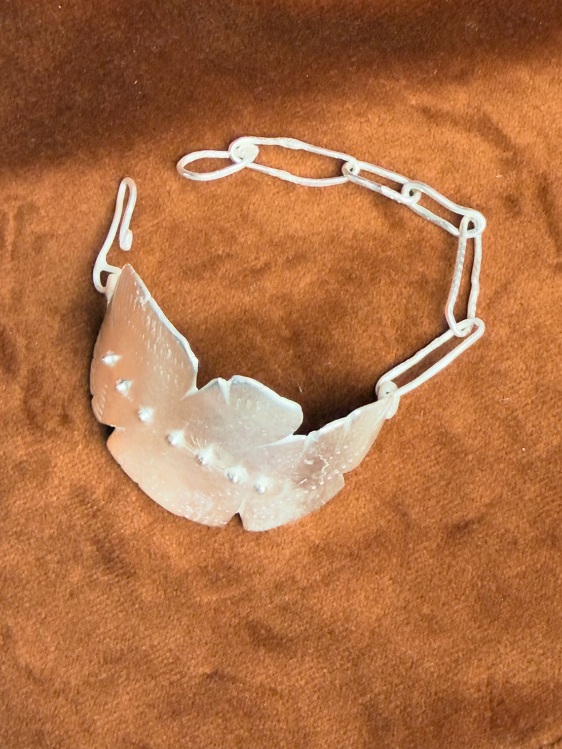 Väger 28,8 gram. Det här är ett substantiellt armband som tar plats på handleden. På ytan små knoppar som fågelstreck på himlen, satta en i taget.