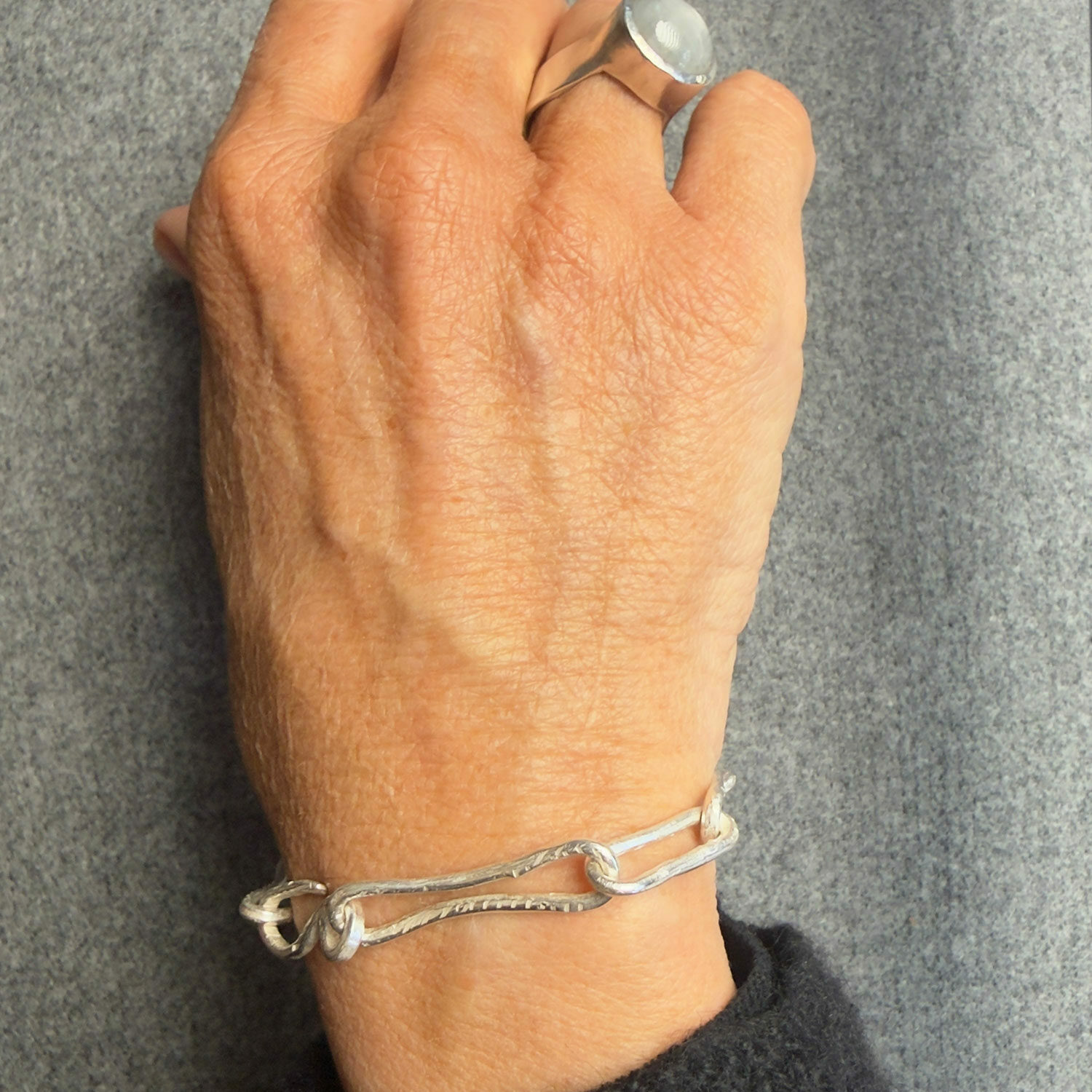Kedjearmband i silver med långa smala länkar i olika storlek, cirka 2-3 cm. Tråden är cirka 2 mm tjock med handfilad struktur. Ett lätt armband med mer substans än en vanlig halslänk, men inte så tungt att du tänker på det hela tiden.