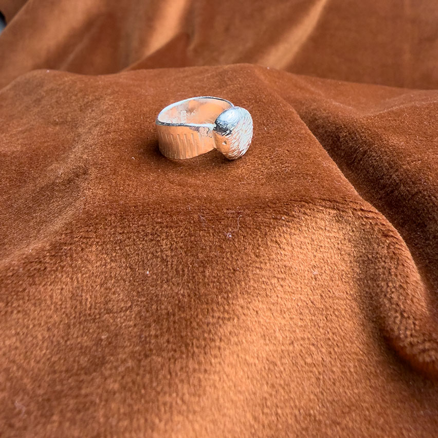 Den här ringen är 8 gram silver med struktur på ytan. Strukturen gör att ljuset fastnar annorlunda än om den varit slät. Organisk form, solid vikt.