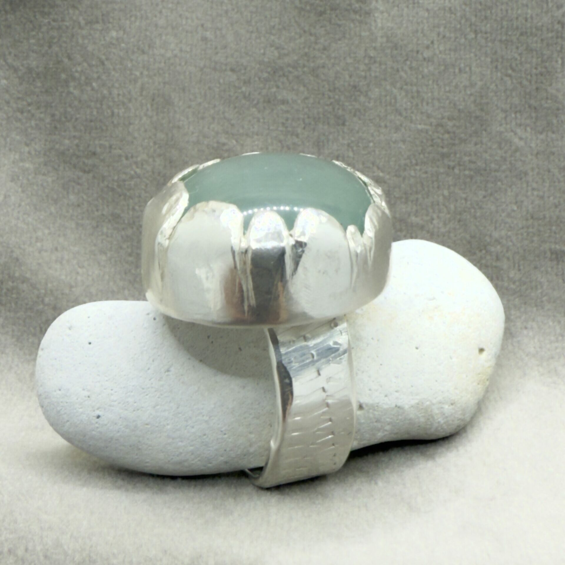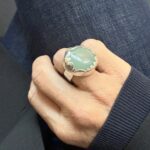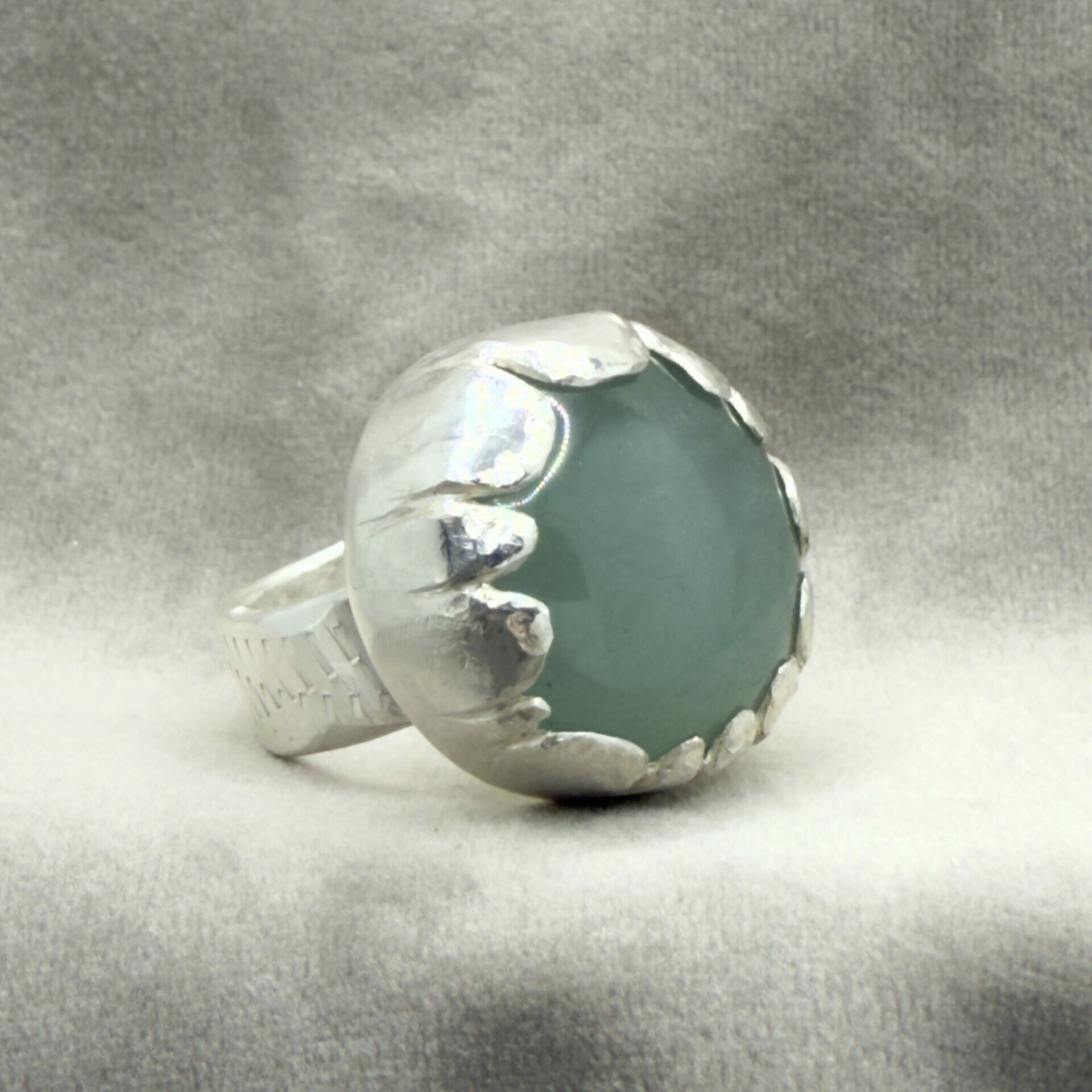 Akvamarinens färg finns från ljust grön mot turkosblå- den här är mjukt havsgrön med drag åt ljusblått. Det är en ring som syns på håll – fattningen är personlig på så sätt att flikarna som fattar stenen är ojämna. Den ger långt ifrån en massproducerad känsla, mer som ett konstverk där detaljerna sticker ut. What if being different is the point?