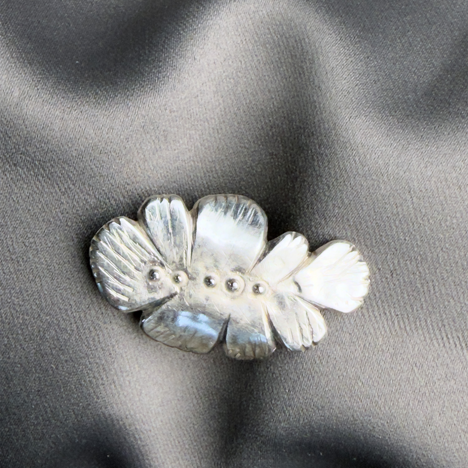 Bladen är hamrade och bearbetade för att få struktur. Fem små korn i silver sitter längs mitten – som händelsepunkter
